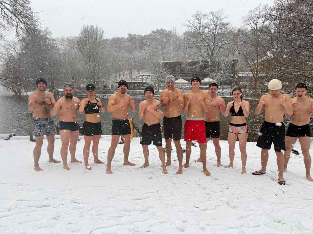 Zum Abschluss gingen wir gemeinsam in den eiskalten Schlachtensee: Kampfstellung, einige Sekunden eintauchen, anschließend Schlag- und Tritttechniken im Wasser. Und dann schnell in die warme Kleidung!